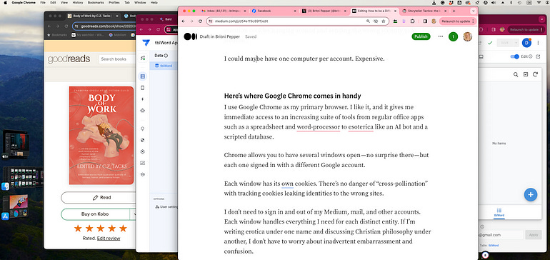I don’t need to sign in and out of my Medium, mail, and other accounts. Each window handles everything I need for each distinct entity. If I’m writing erotica under one name and discussing Christian philosophy under another, I don’t have to worry about inadvertent embarrassment and confusion.